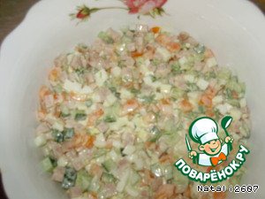 Огурец нарезать небольшим кубиком.