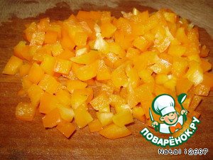 Болгарский перец очистить от семян, плодоножки и сухожилий, нарезать кубиком.