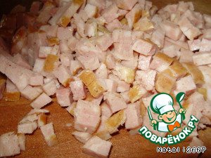 Нарезать колбасу небольшими кубиками. Если нет такой, как у меня, то замените на самую любимую и вкусную! Или на копченое мясо!