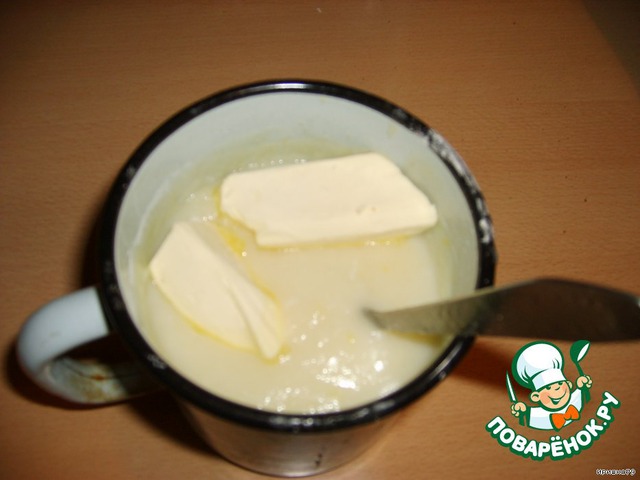 • Варим заварной крем. В емкость выливаем стакан молока, добавляем стакан сахара и яйцо, хорошо взбиваем, затем добавляем муку и тоже хорошо взбиваем. Доводим на медленном огне до загустения. Снимаем с огня и добавляем сливочное масло