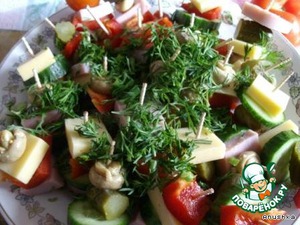 Все режем крупными кусочками и в произвольном порядке накалываем на шпажки.