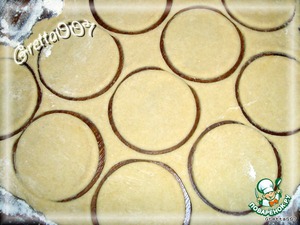 Раскатать тесто толщиной 3 мм. Вырезать круглые лепешки... диаметром 6 - 10 см. кому как нравится.