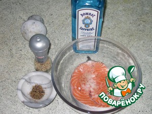 Измельчить можжевеловые ягоды (я измельчила в ступке). Рыбное филе посыпать смесью соли, перца и ягод можжевельника со всех сторон и облить джином.