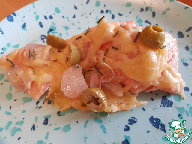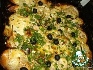 Маринованную рыбу выложить на противень, смазанный растительным маслом. Выложить лук кольцами.