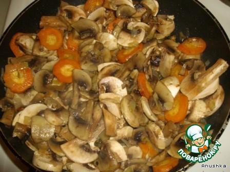 • Добавляем порезанные грибы. Солим по вкусу. Перемешиваем. Обжариваем минут 10.