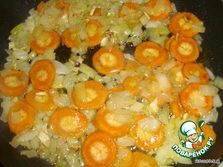 • Обжариваем на масле порезанный лук и морковку, порезанную кружочками