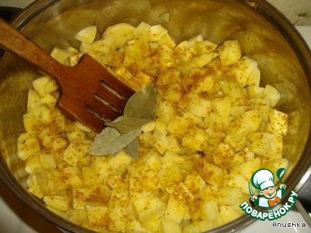 • В большую кастрюлю на дно наливаем масло, выкладываем порезанную кубиками картошку. Добавляем лавровый лист, перец, кориандр, корень петрушки и карри. Перемешиваем и тушим под крышкой, периодически помешивая минут 5-10.
