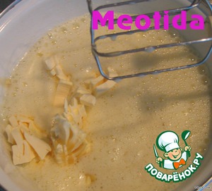 Теперь всыпаем муку, сливки и разрыхлитель, все хорошенько взбиваем, до получения однородной кремообразной массы