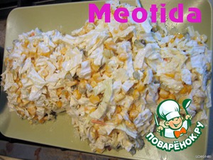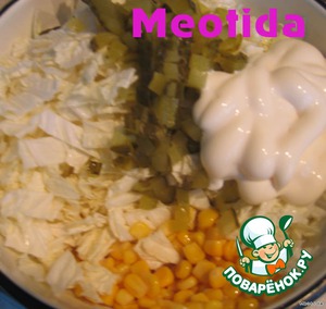 Мелко нарезаем капусточку, огурчик и смешиваем с кукурузкой и майонезом (или смесью сметаны и горчицы)
