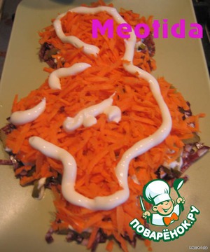Теперь слой тертой на крупной терке морковочки, слегка смазываем майонезом (или смесью сметаны и горчицы)