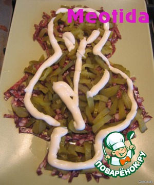 Нарезаем колбасу и 1 соленый огурец тонкой соломкой и выкладываем на большое блюдо, смазываем слегка майонезом (или смесью сметаны и горчицы)