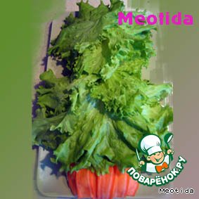Сверху делаем крону дерева из листьев салата, а ствол из морковки (я сняла тонкие пластинки с морковки с помощью ножа для чистки овощей)...