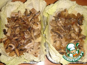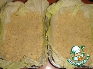 Выложить формы листьями пекинской капусты в один слой, предварительно срезав толстую часть стебля.