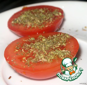 Помидоры разрезать на половинки и посыпать базиликом.