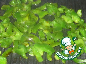 На разогретой сковороде с оливковым маслом обжарить перец в течение 5 минут. Выложить.