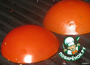 На сковороду выложить помидоры срезом вниз и обжарить до золотисто-коричневого цвета.
