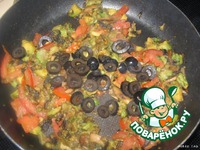 К овощам, добавляем оливки, нарезанные колечками. Немного оставим, для украшения.