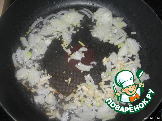 Репчатый лук, нарезать соломкой, чеснок мелко нарезать, обжарить всё это на оливковом масле (можно на растительном без запаха). Сразу поставить воду для спагетти.