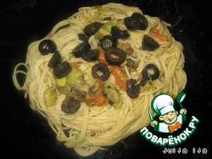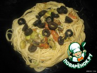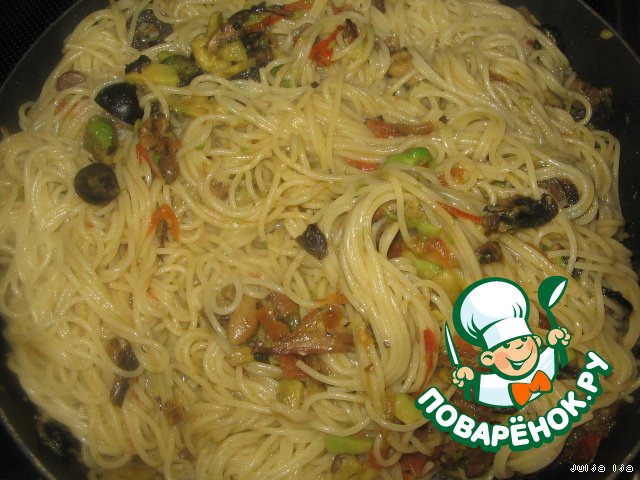Готовые спагетти откидываем на дуршлаг, немного воды оставляем, выкладываем в сковородку к овощам. Если Вам покажется сухо, добавляем оставленную водичку со спагетти.