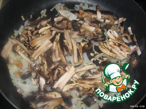 Добавить шампиньоны, нарезанные соломкой. Обжарить минуты 3 всё вместе, на сильном огне.