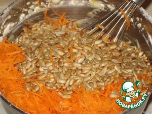 В тесто добавить морковку и семечки. Перемешать ложкой, чтобы все распределилось равномерно.