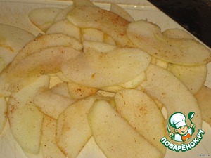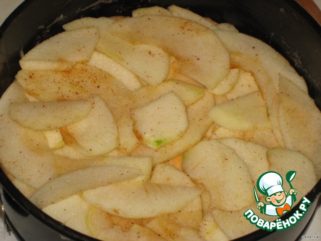 Выложить половину теста, на тесто выложить равномерно порезанное яблоко.