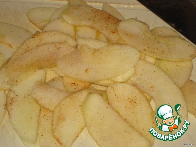 Яблоко очистить от шкурки, нарезать тонкими ломтиками, сбрызнуть соком лимона и корицей.