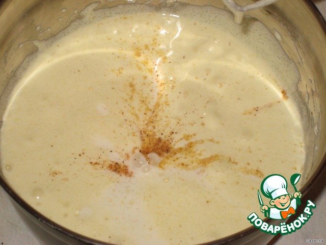 Яйцо и желток взбить с медом и сахаром в белую массу, добавить кефир, мускатный орех и имбирь, перемешать.