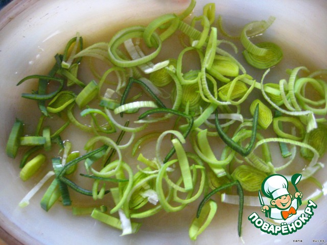 Огнеупорное блюдо смазать растительным маслом, выложить лук-порей, нарезанный кольцами.