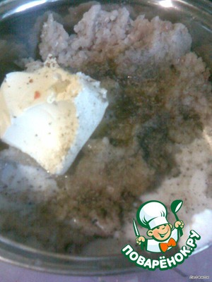 Добавить яйцо,молоко,маргарин,специи,соль,перец.Вымесить фарш до однородности.Если фарш покажется жидковатым,добавьте молотых сухарей для панировки. -