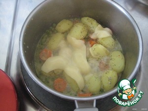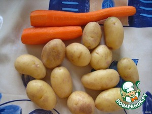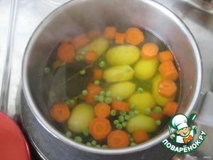 В кипящем бульоне, (подсоленном) варим очищенные картофель (целиком) и морковь (дольками) около 15 мин, с лавровым листом.