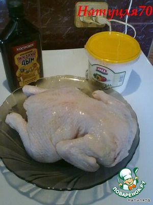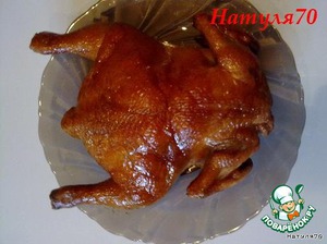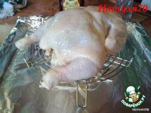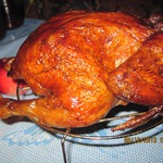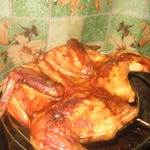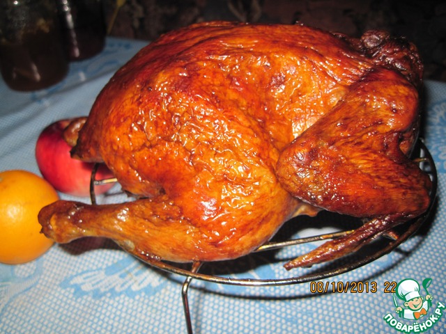 И ставим в духовку. Температура средняя. Курочка будет коптиться часа три. В процессе надо покрывать ее соусом 3-4 раза. Готовность легко определить по шоколадному оттенку кожицы.