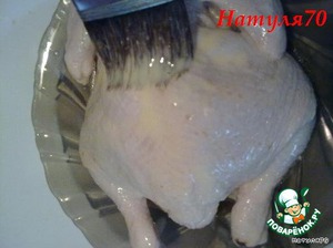 Обмазываем соусом курочку снаружи и внутри. Остатки соуса не выливаем.