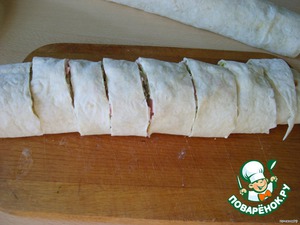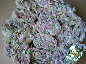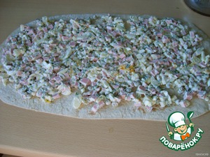 Затем весь наш салатик раскладываем ровненьким слоем на лаваш