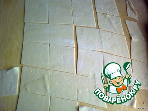 Делаем тесто и раскатываем его в пласт. Режем на квадраты