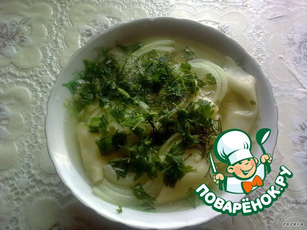 Заливаем бульоном, кладем лучка и посыпаем зеленью.