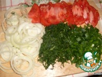 Нарезаем кольцами лук, тонкими ломтиками помидорчик, мелко- зелень: зеленый лук, укроп, петрушку. |