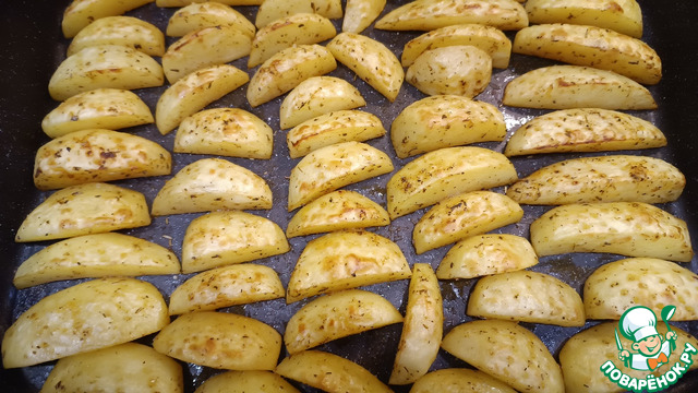 3. Картофель сбрызнуть маслом, посыпать подготовленной смесью, выложить в форму для запекания в один слой.