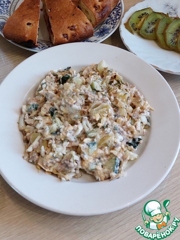 Из консервы сливаем масло и разминаем вилкой, потом добавляем в овощи.