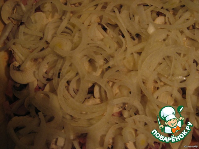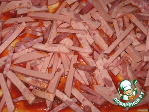 Нарезала соломкой всю колбасу и выложила, равномерно распределив по всей поверхности