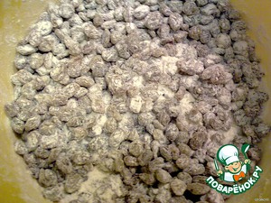 Изюм промыть, подсушить на бумажном полотенце, обвалять в муке