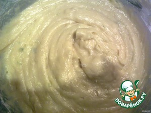 Тесто перелить в миску, добавить измельченную цедру, муку, осторожно перемешивая деревянной лопаточкой