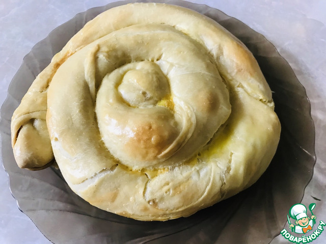 Тесто с начинкой осторожно cвернуть рулетом и переложить на смазанную жиром сковороду, свернуть рулет спиралью, смазать яичным желтком и испечь в духовке.