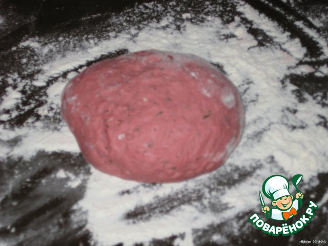 В розовую жидкость добавляем 15 г сливочного масла, половину опары и половину зелени с чесноком. Замесить тесто, постепенно добавляя муку. -