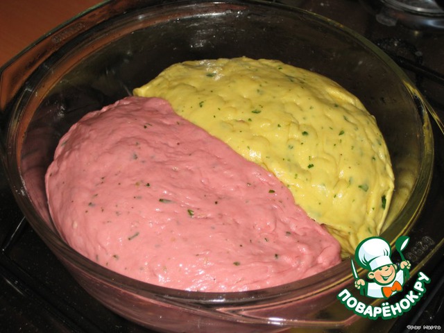 Формы для хлеба у меня нет, поэтому я пекла свои булочки в форме из-под микроволновки. Смазываем форму растительным маслом, отрываем кусочек розового теста, хорошо вымешиваем и кладем с одной стороны, так же поступаем с желтым тестом и кладем его с другой стороны. Даем подняться, смазываем верх взбитым яйцом и ставим в разогретую духовку, выпекаем 40 минут при температуре 180-200*С.