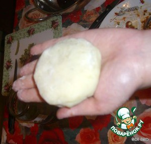 Затем надо приплюснуть шарик так, чтобы получилась круглая котлета(5 см в диаметре, высота 0,5 см).