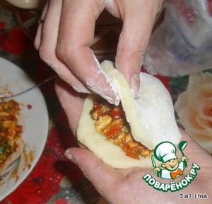 Положить ее на левую ладонь, сверху положить 1 ст.л. начинки, накрыть второй половинкой.