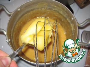 Снять масляно-мучную смесь с огня и ввести в нее мед.