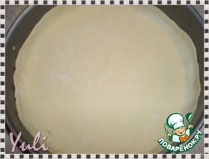 Разморозить слоеное тесто, раскатать его по диаметру формы (26 см), вырезать круг, оставив запас на высокие бортики пирога.