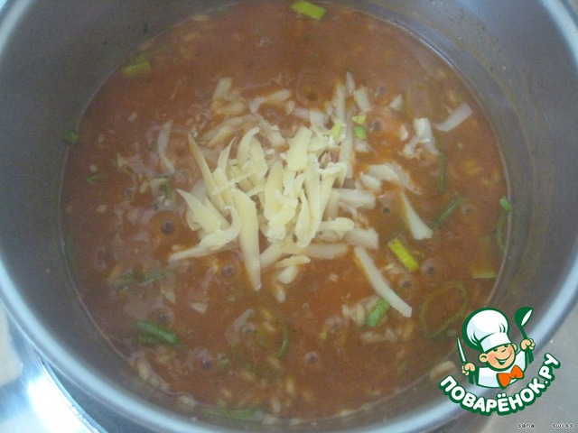 На разогретом масле (1-2 ст. л) обжарить томат, добавить рис и жарить около 2-3 мин., постоянно помешивая.